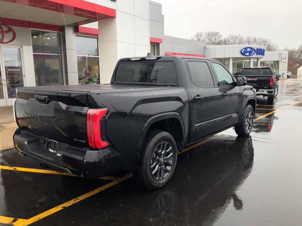 power bed step and step cover, TRI-FOLD TONNEAU COVER (TMS), speedometer, navigation and hybrid system indicator, ALL WEATHER FLOOR LINERS (TMS). Toyota Platinum Hybrid with Midnight Black Metallic exterior and Black interior features a V6 Cylinder Engine with 437 HP at 5200 RPM*.